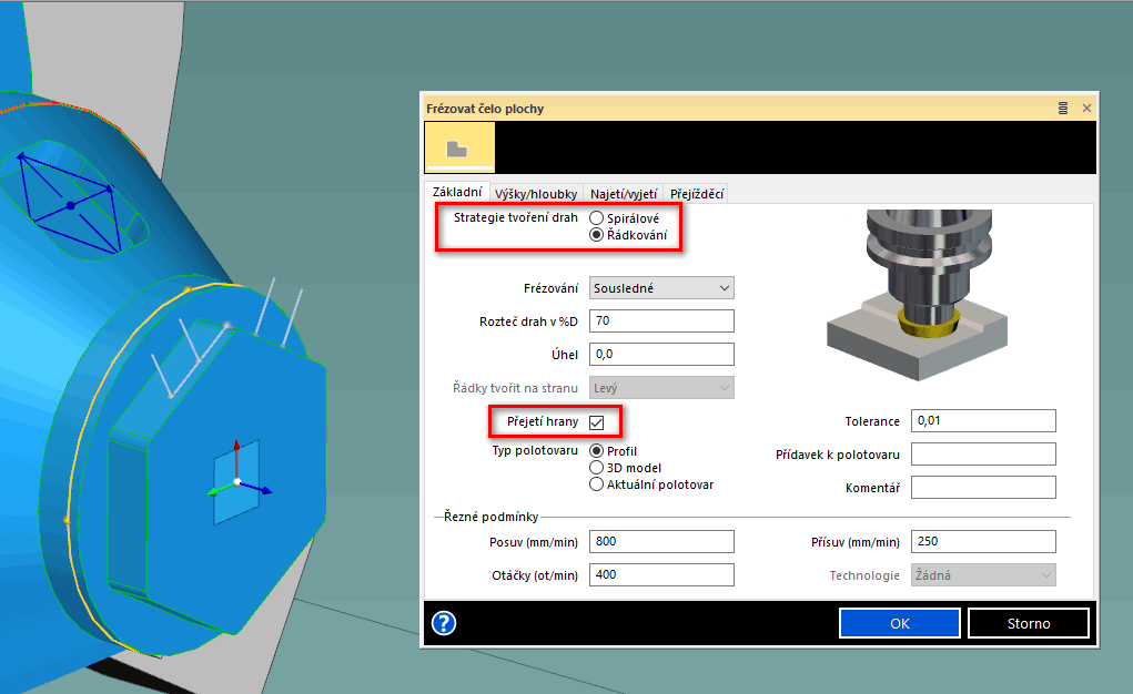 Frézování čela plochy a nová nastavení strategie a přejezdu